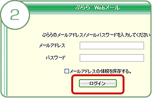 表示されたログイン画面で、ぷららWebメールを利用するメールアドレスとメールパスワードを入力し、ログインボタンをクリックしてください。