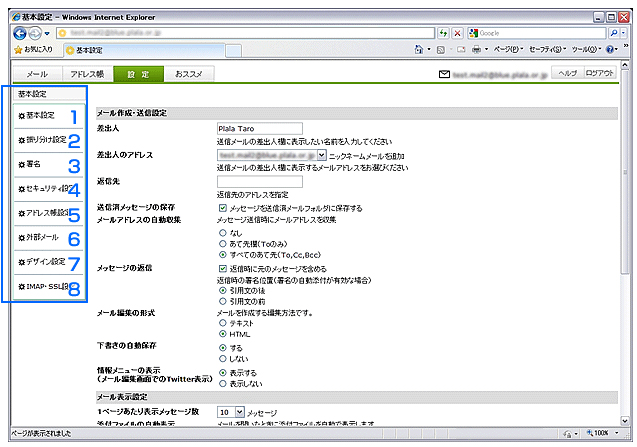 ぷららWebメールをより便利に使うための設定を行う画面です。