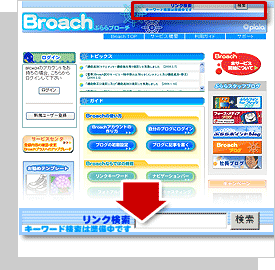 BroachのトップページもしくはBroach内のブログページの検索部分のリンク検索を選択し、空欄に検索したいキーワードを入力して、「検索」ボタンをクリックします。 |